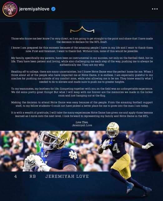 Notre Dame RB Jeremiyah Love announced he is declaring for the NFL draft.