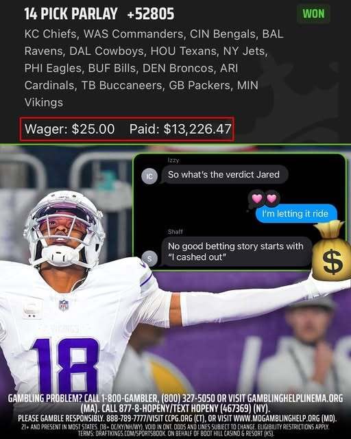 No good betting story starts with “I cashed out” This bettor let his ticket ride on the Vikings, and made over $13K.
