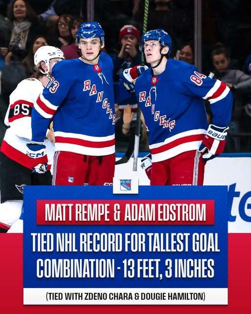Matt Rempe (6′9″) and Adam Edstrom (6′6″) tied the record for tallest combination of goal scorer and primary assister in NHL history last night. They also teamed up last February.