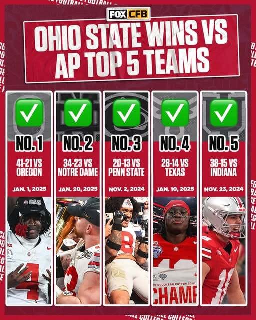 @OhioStateFB’s five wins vs AP top 5 opponents this season is the most in the AP Poll era (since 1936