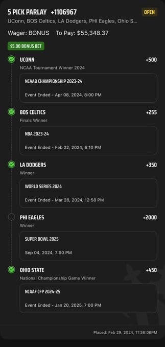 COULD WIN $55K OFF A $5 BONUS BET IF EAGLES WIN THE SUPER BOWL