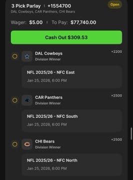 $5 to win $77K division long shots parlay still alive...